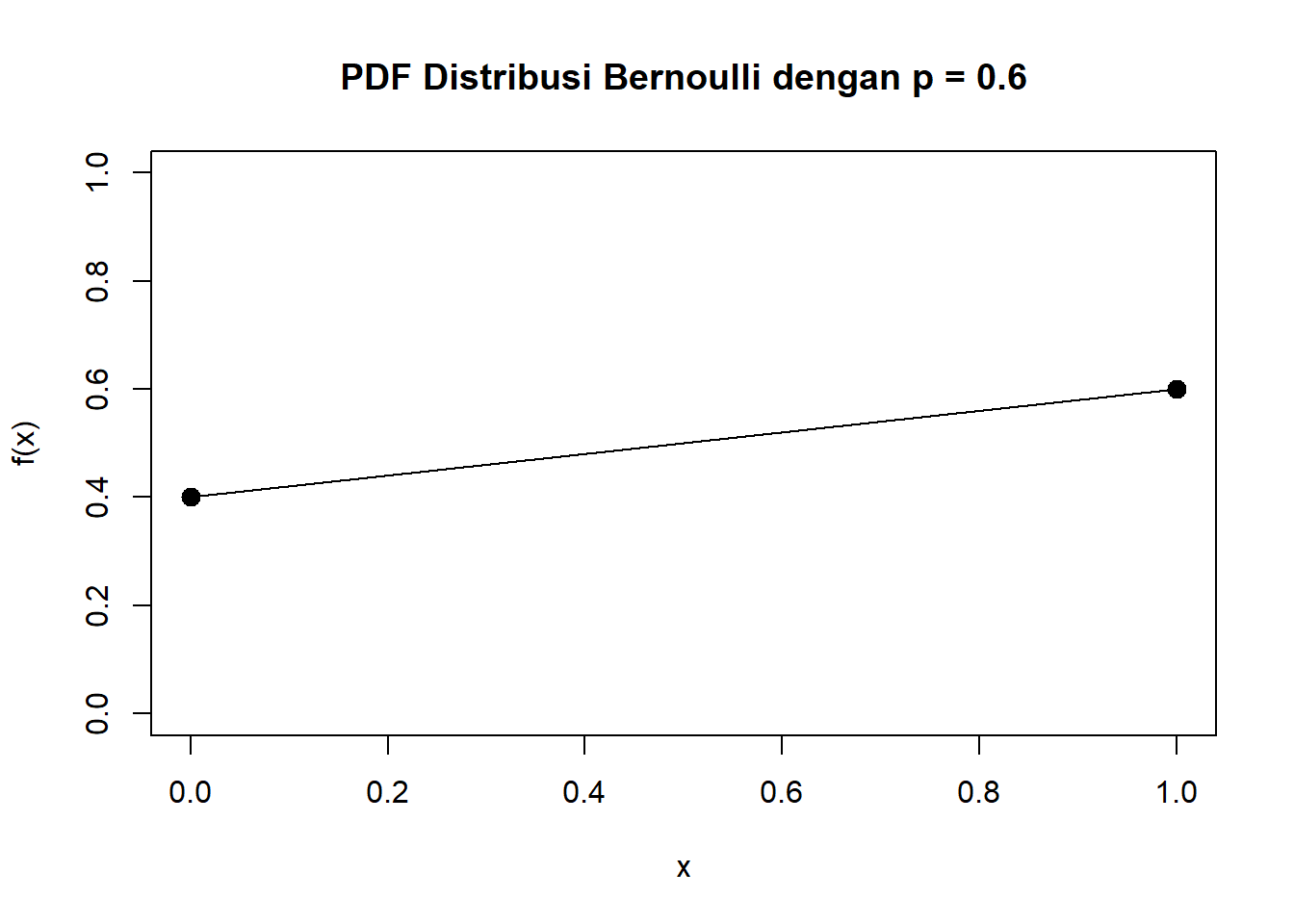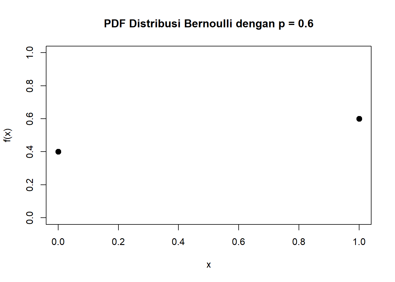 main = "PDF Distribusi Bernoulli dengan p = 0.6",