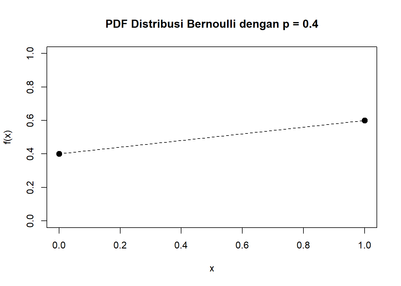 main = "PDF Distribusi Bernoulli dengan p = 0.4",