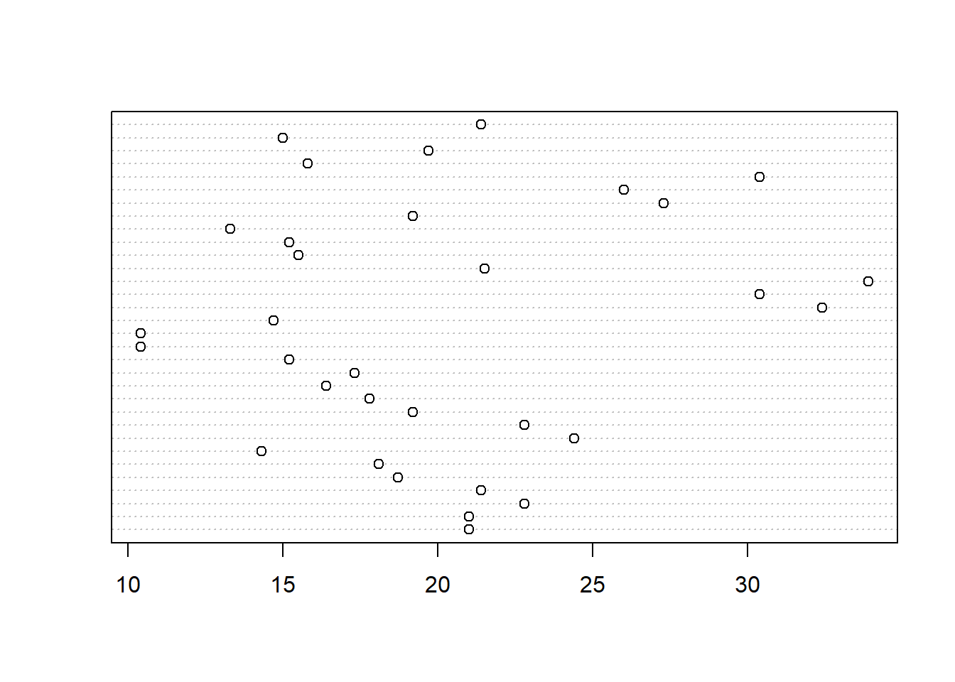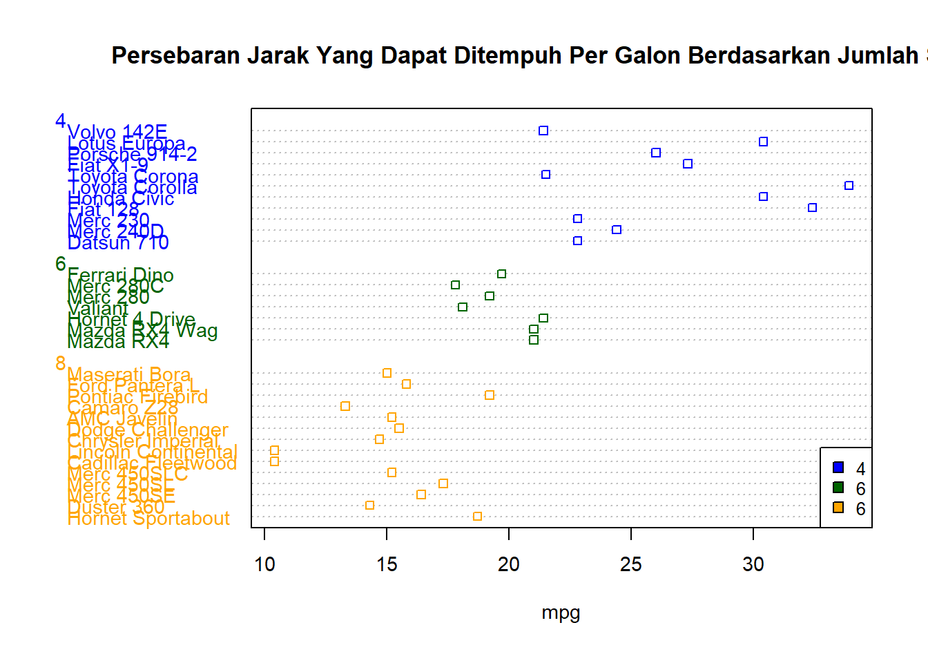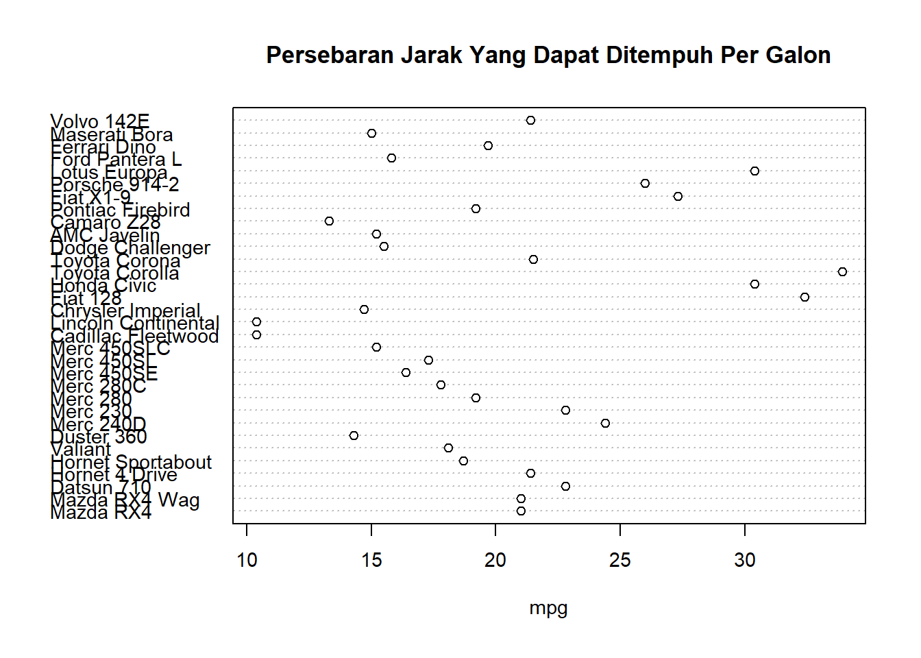 dotchart(mtcars$mpg, labels = row.names(mtcars),