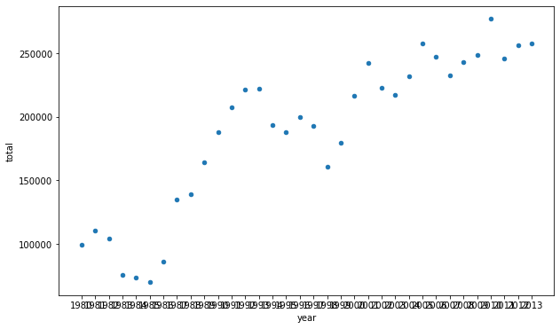 df_total.plot('year','total',kind='scatter',figsize=(10,6))