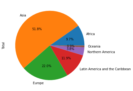 df_continents['Total'].plot(kind='pie',figsize=(5,6),autopct='%1.1f%%') #yang persen gaje nambahin persen