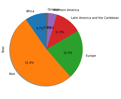 df_continents['Total'].plot(kind='pie',figsize=(5,6),autopct='%1.1f%%',startangle=90,shadow=True) #wow diputer 90 derajat plus ada bayangan