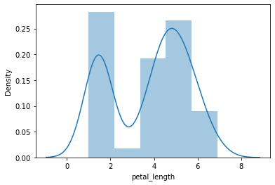 sns.distplot(iris['petal_length'])F:\kim\anaconda3\lib\site-packages\seaborn\distributions.py:2557: FutureWarning: `distplot` is a deprecated function and will be removed in a future version. Please adapt your code to use either `displot` (a figure-level function with similar flexibility) or `histplot` (an axes-level function for histograms).