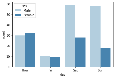 sns.countplot(x='day',data=tips,hue='sex',palette='Blues')