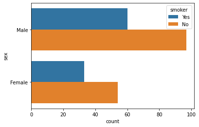 sns.countplot(y='sex',data=tips,hue='smoker')