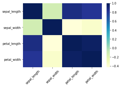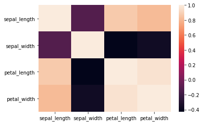 iris.drop('species', axis=1, inplace=True)iris.corr()| sepal_length | sepal_width | petal_length | petal_width | |