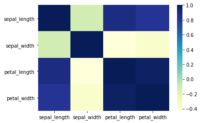 sns.heatmap(iris.corr(),cmap='YlGnBu')
