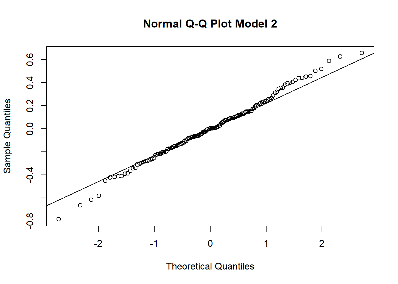 qqline() menambahkan garis referensi (garis diagonal) yang menunjukkan distribusi normal. Titik-titik yang mengikuti garis ini mengindikasikan bahwa residual mendekati distribusi normal.