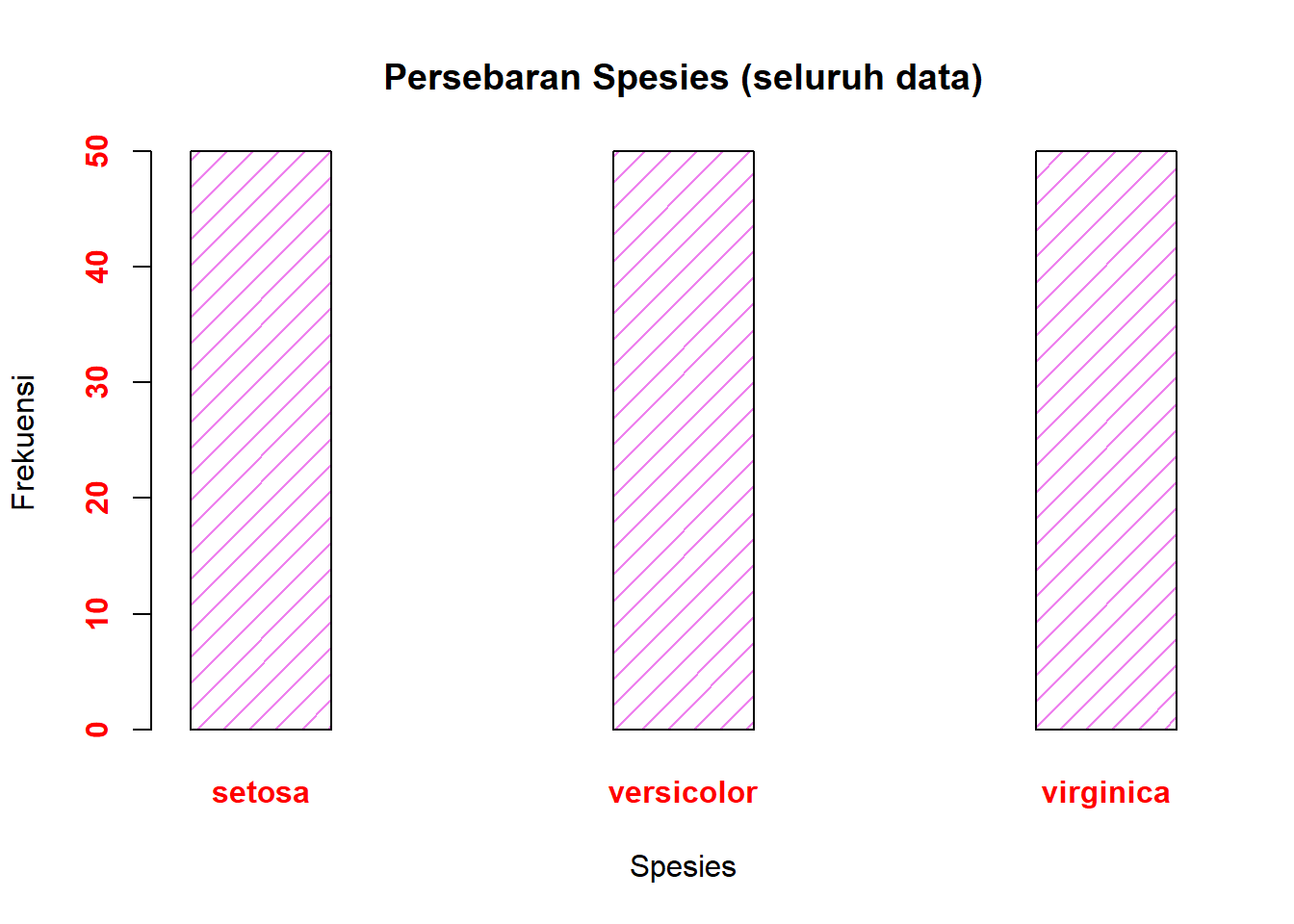 Ternyata hasilnya tidak begitu menarik, ketiga spesies tersebar rata. Tidak masalah, kita bisa mencoba mem-filter data dengan kriteria tertentu, barulah membuat tabel frekuensinya.