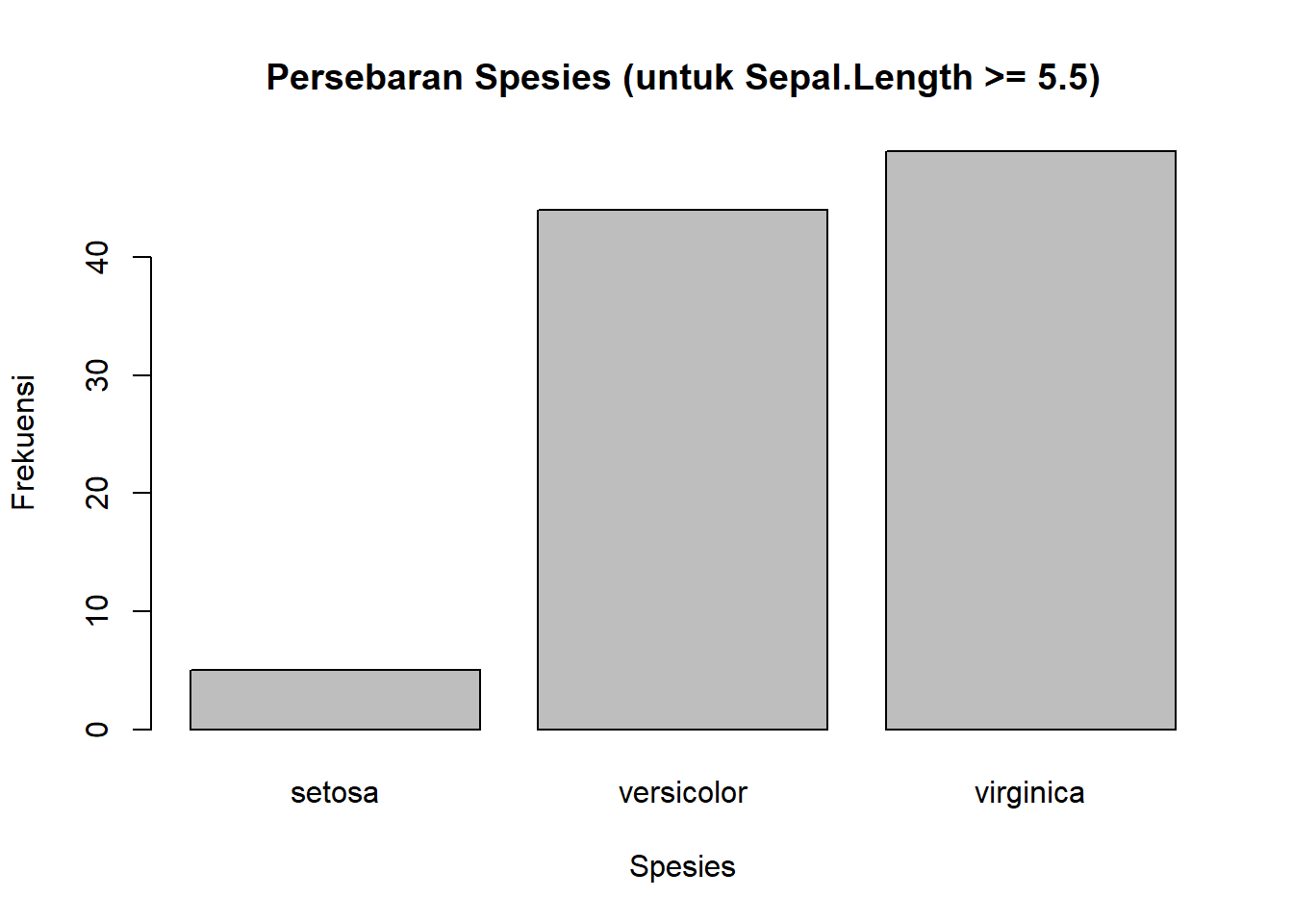 Sebagai contoh, kita penasaran bagaimana persebaran spesies ketika panjang sepal atau Sepal.Length cukup besar, minimal 5.5. Kita bisa filter terlebih dahulu dengan fungsi subset, dan menyimpan hasil saringannya (yang berupa data frame) ke dalam suatu variabel baru, misalnya df1_longsepal