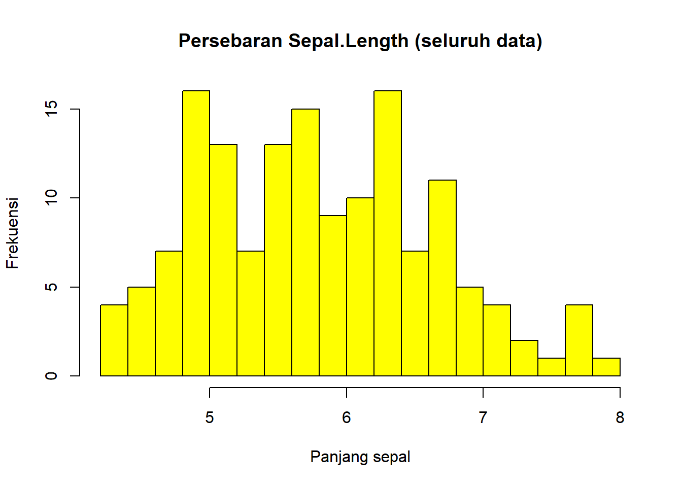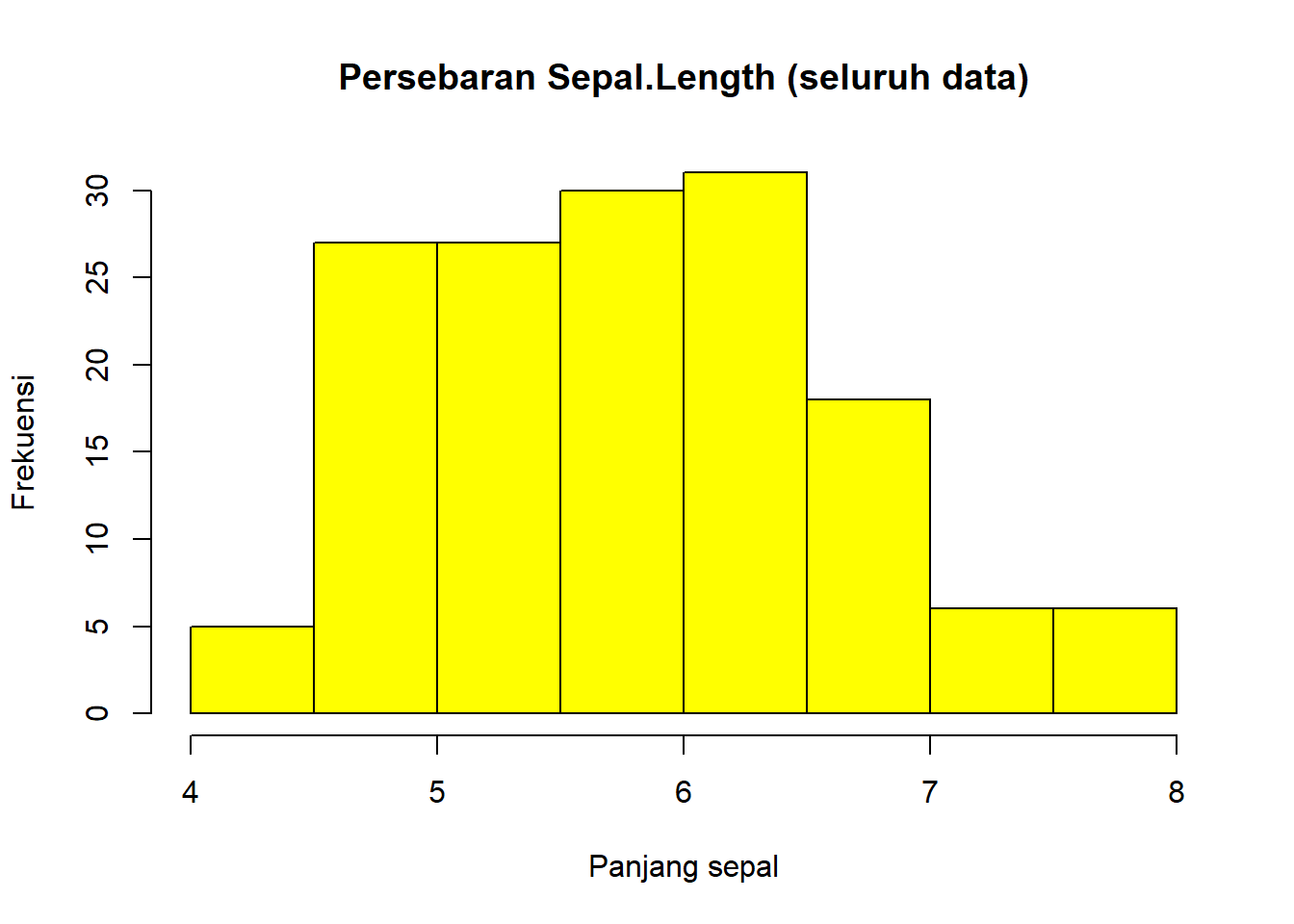 Fungsi yang digunakan adalah hist. Sebagai contoh, berikut gambaran persebaran Sepal.Length