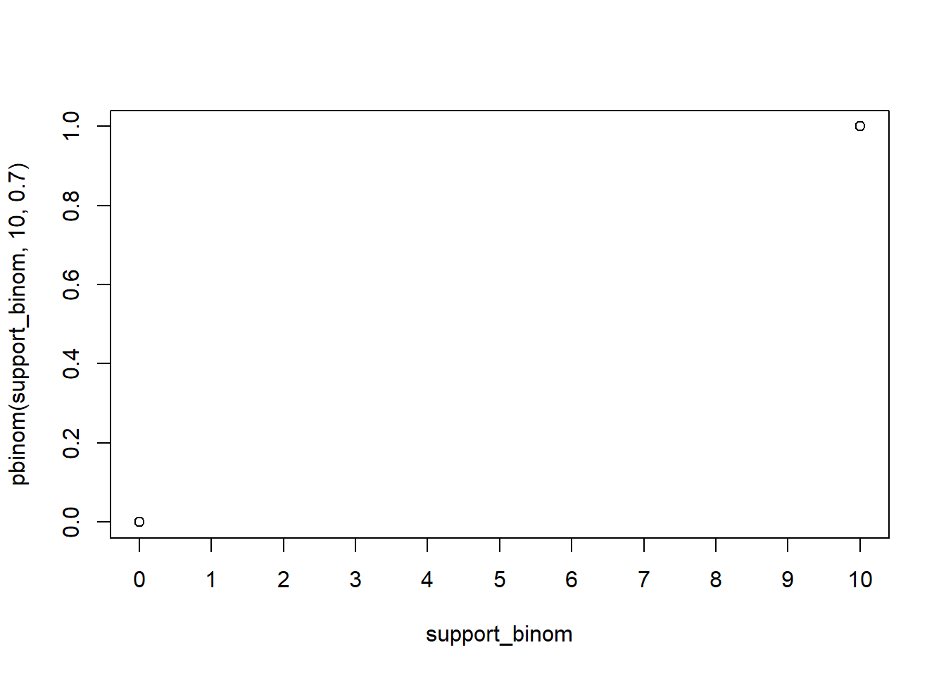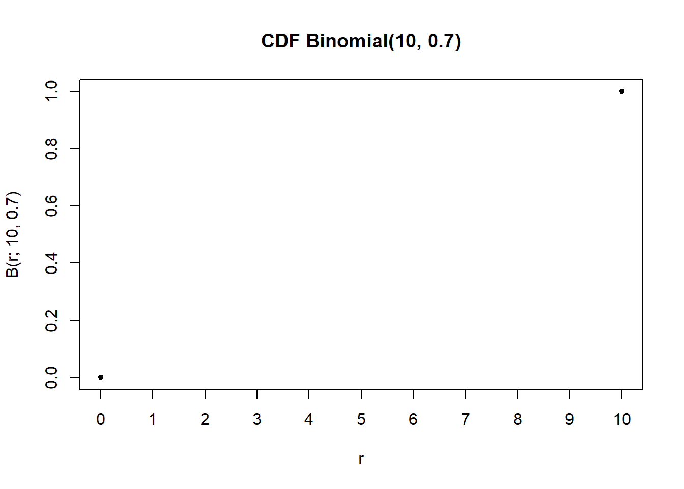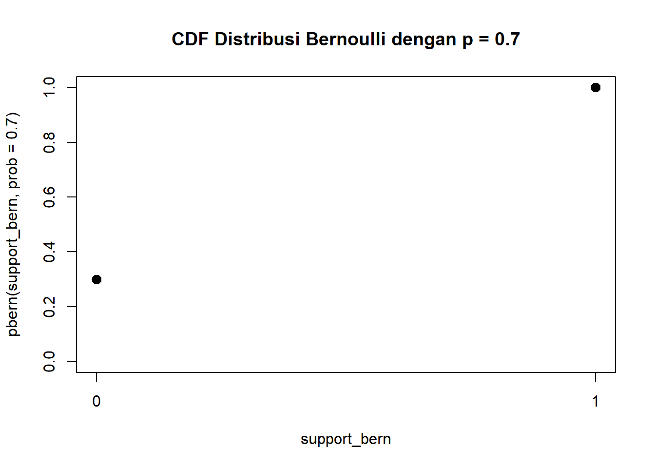 plot(support_bern,pbern(support_bern, prob =0.7),ylim =c(0, 1),xaxp =c(0, 1, 1),main ="CDF Distribusi Bernoulli dengan p = 0.7",pch =20,cex =2)