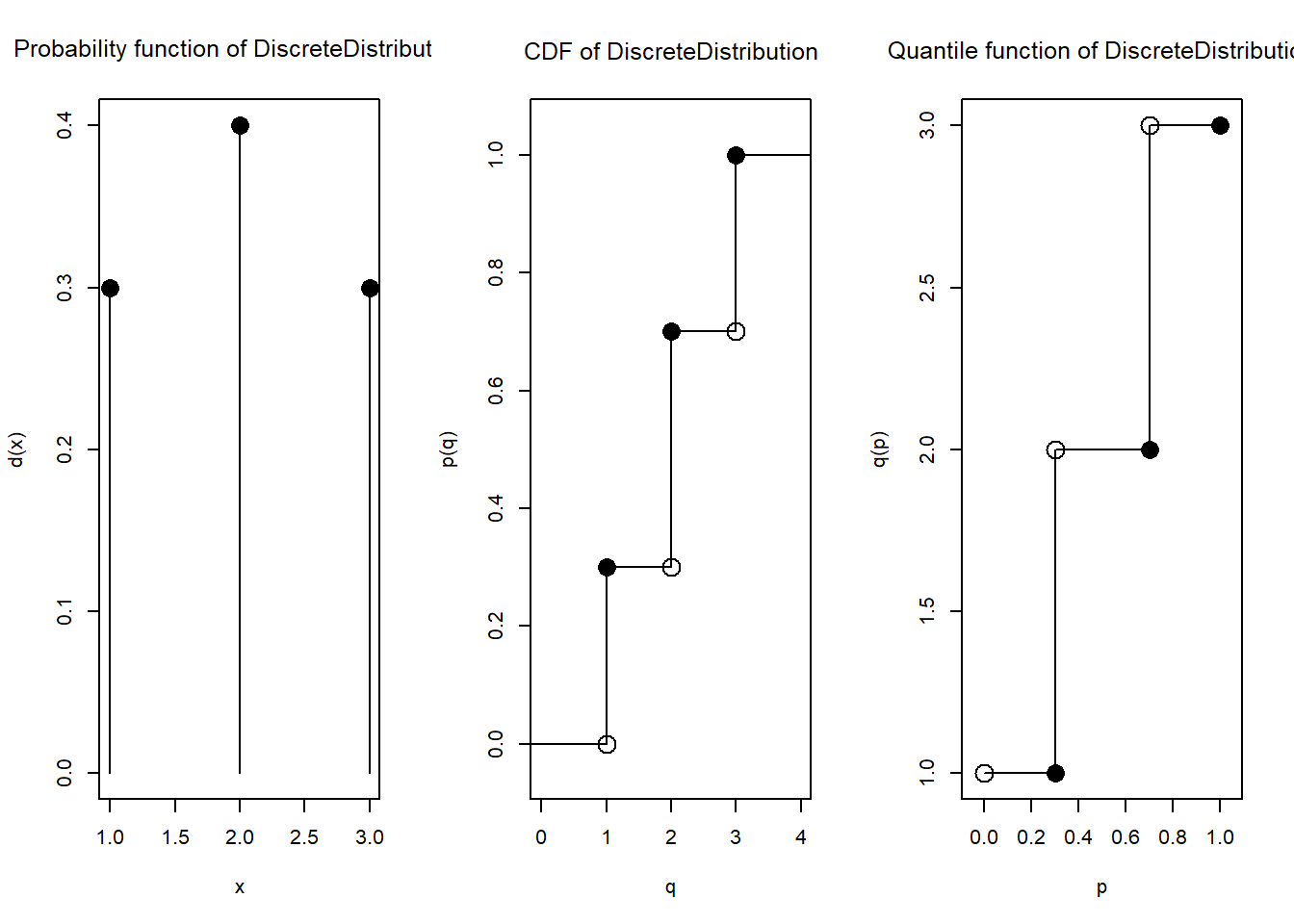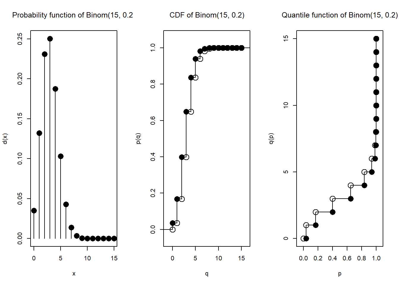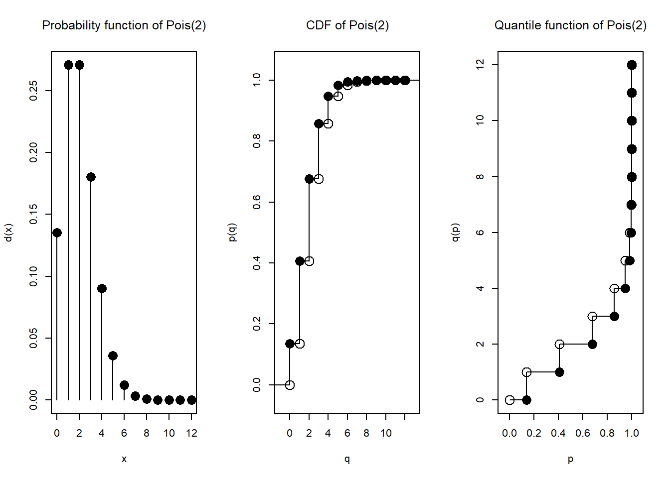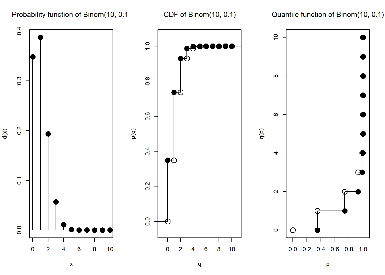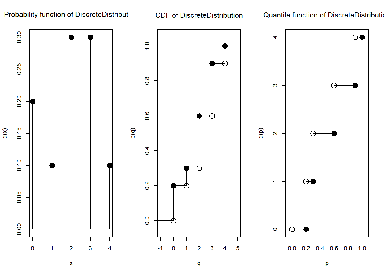 Di kalangan R, sudah ada semacam standardisasi agar tiap distribusi (baik diskrit maupun kontinu) diwakili oleh empat fungsi, yang namanya berawalan d, berawalan p, berawalan q, dan berawalan r.
