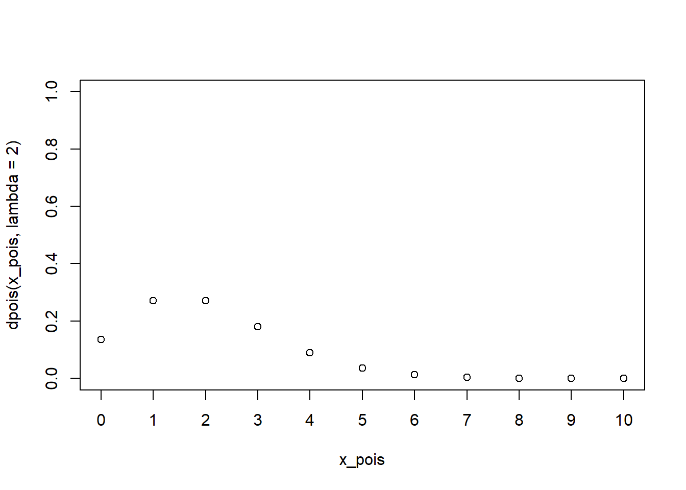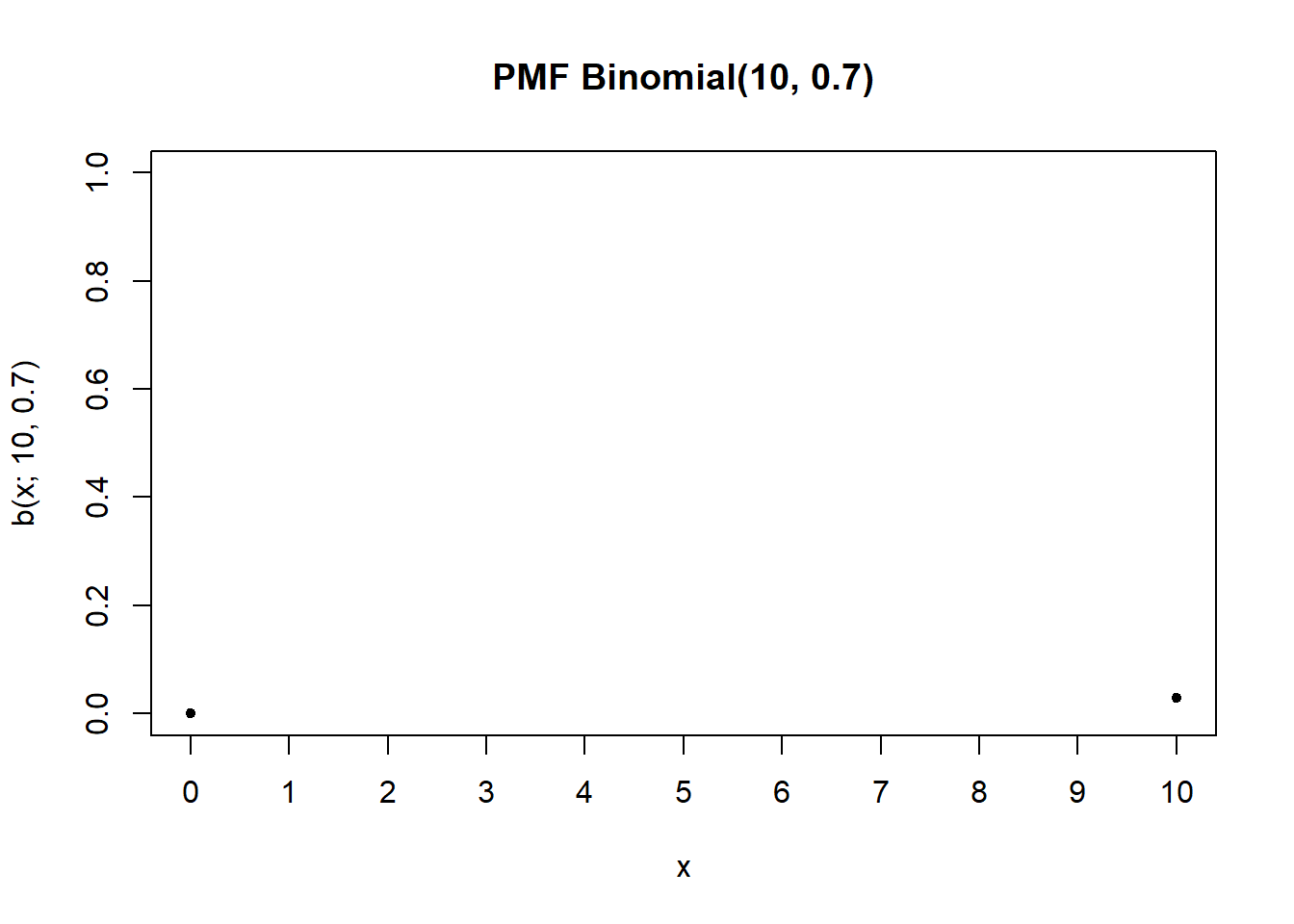 Plot PMF memang seperti itu, hanya terdiri dari titik-titik saja, toh PMF memang untuk distribusi diskrit. Kebetulan, secara pemrograman, kita sedang menggambar scatter plot di base R.
