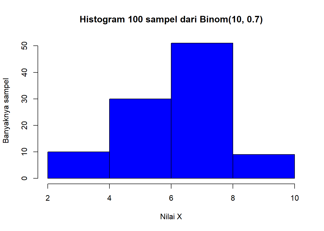 Sebagaimana yang sudah dijelaskan sebelumnya, distribusi binomial menggambarkan proses Bernoulli, yaitu percobaan gagal/sukses yang dilakukan berkali-kali, misalnya \(n\) kali.