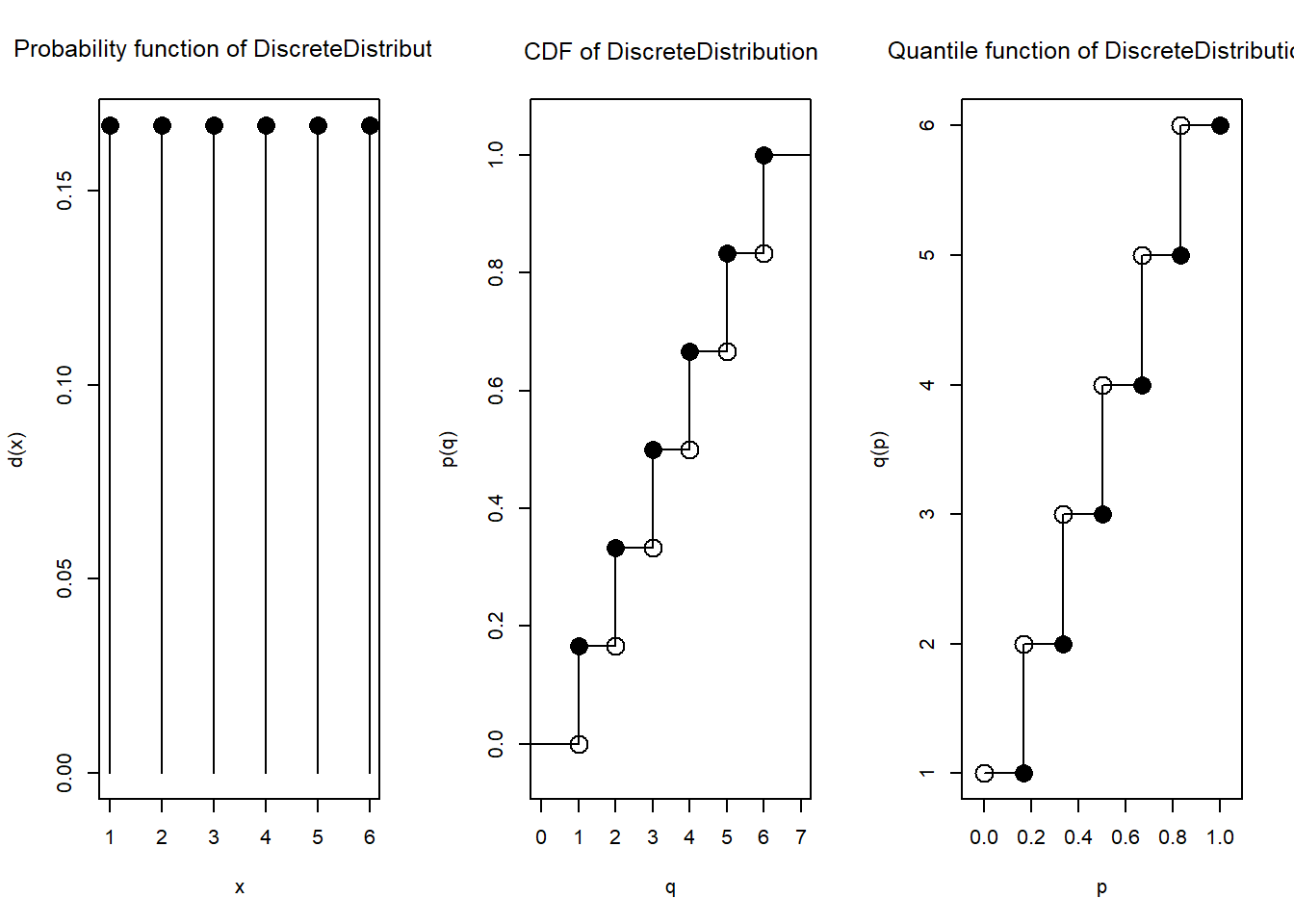 supp5 <-c(1, 2, 3, 4, 5, 6)k <-length(supp5)prob5 <-rep(1/k, k) # 1/k sebanyak k kalidist5 <-DiscreteDistribution(supp5, prob5)
