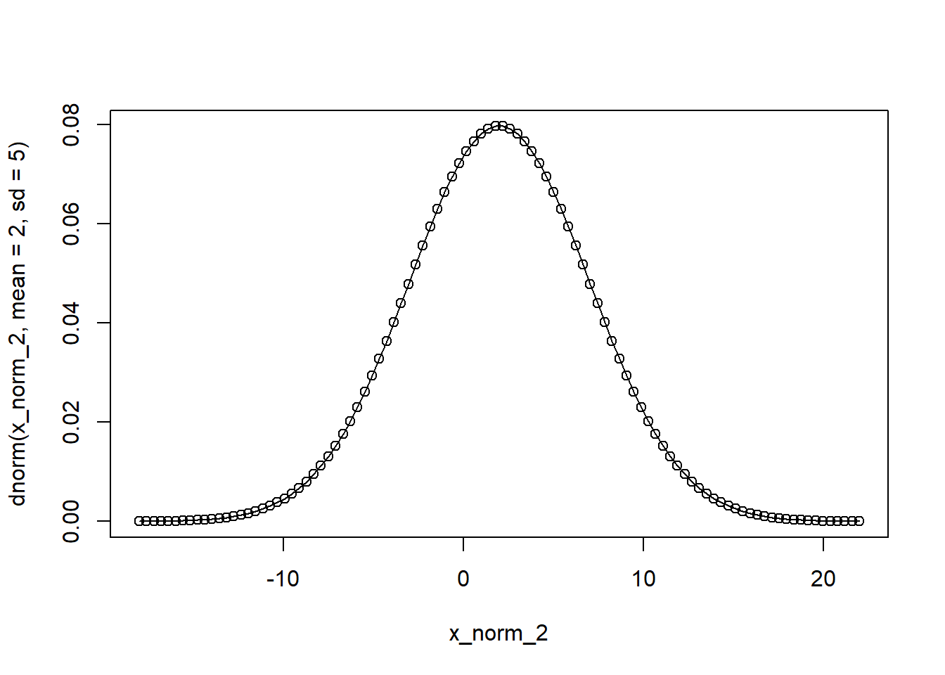 Untuk membuat plot dari \(N(2,5)\), kita buat titik-titik x_norm_2 sedemikian sehingga nilai-nilainya berada di sekitar rata-rata 2, tetapi dengan interval yang lebih luas, misal \(2 \pm 20\), karena standard deviation yang lebih besar dibandingkan dengan membuat plot \(N(0,1)\) tadi.