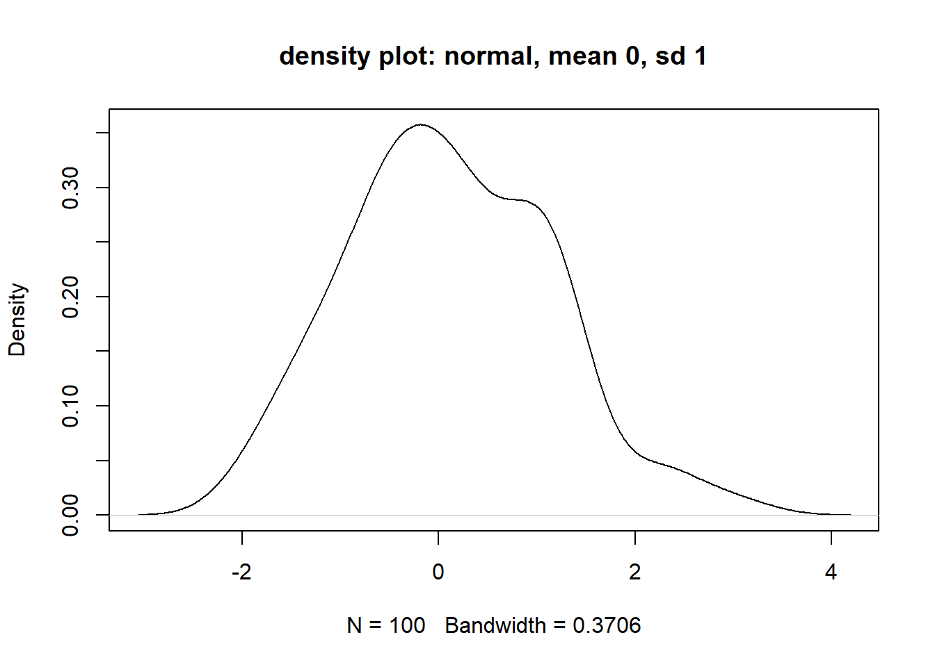 Untuk distribusi kontinu, selain membuat histogram, kita juga bisa membuat yang namanya density plot. Intinya, ini adalah perkiraan bentuk distribusi kontinu berdasarkan data yang diberikan. Dalam hal ini, dengan data random yang kita miliki, kita bisa mencoba membentuk kembali perkiraan bentuk distribusi aslinya, yakni distribusi normal.