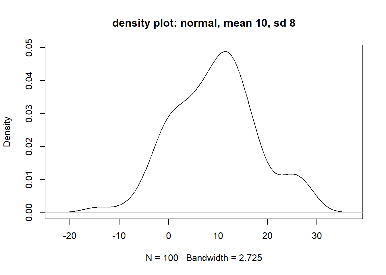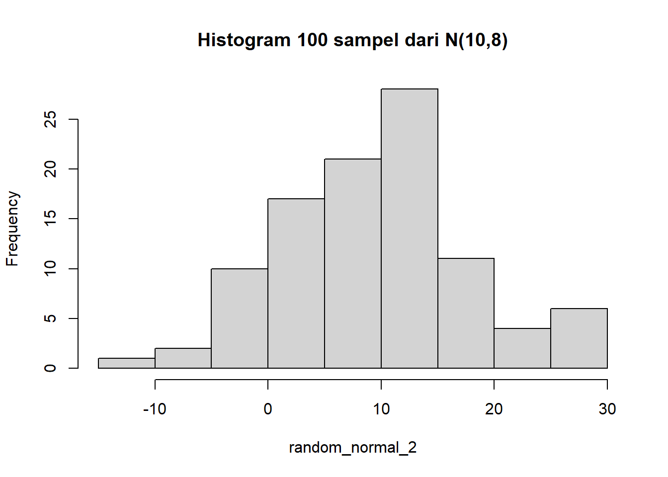 Kita baru mencoba menarik data random dari \(N(0,1)\), tapi tentunya kita bisa melakukan langkah yang sama hingga plotting untuk parameter lain, misalnya rata-rata \(\mu=10\) dan standard deviation \(\sigma=8\).