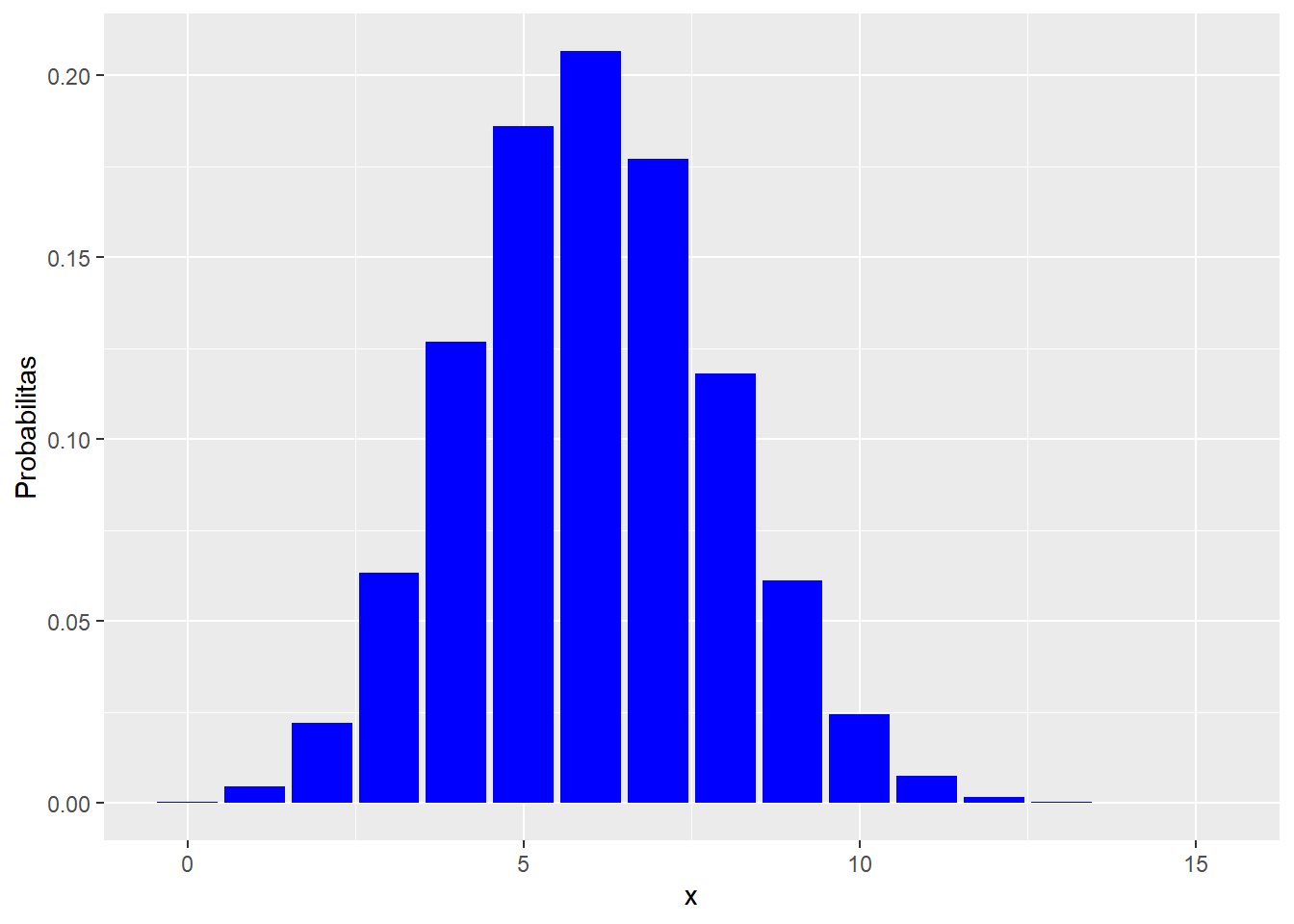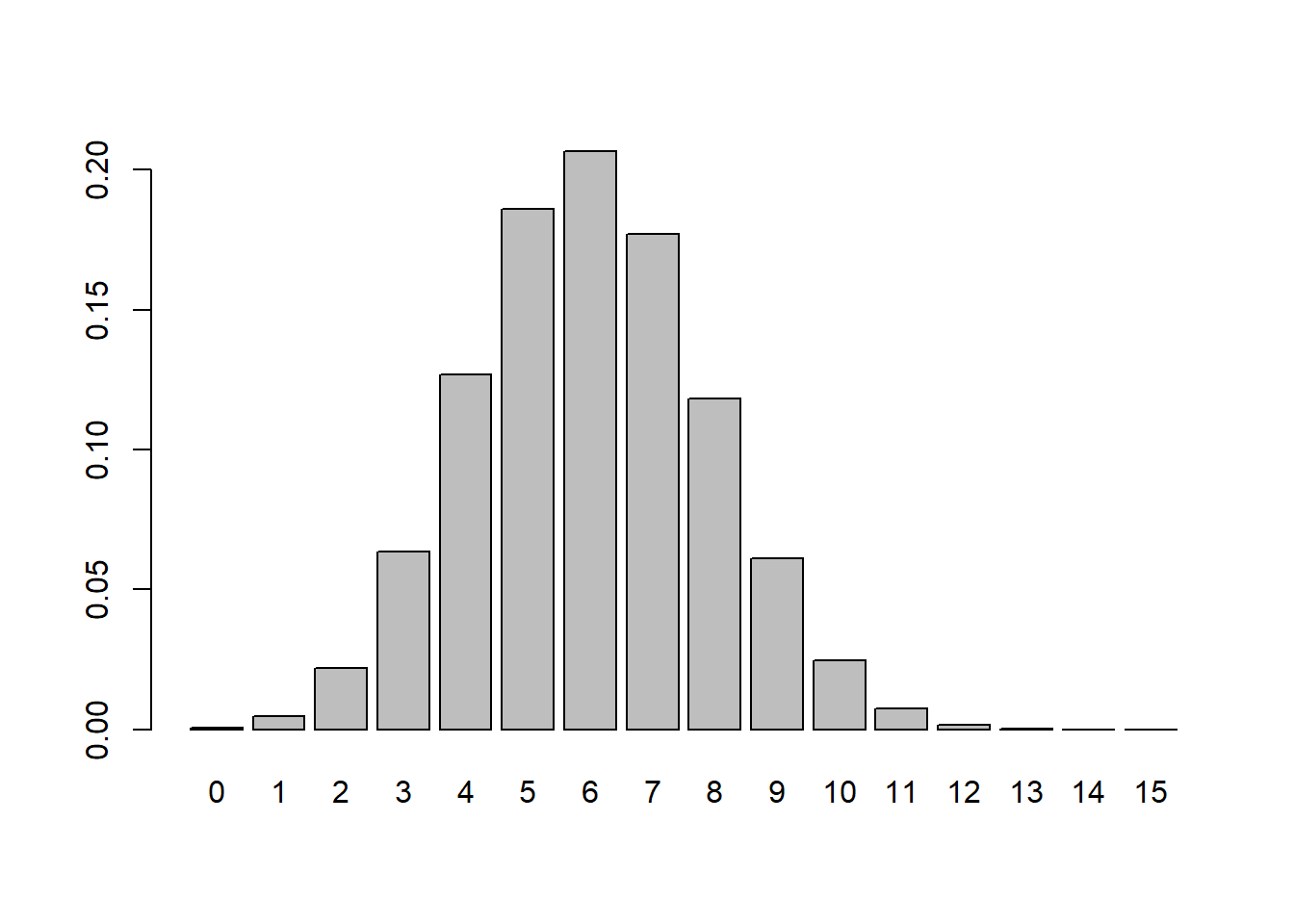 Misalkan kita membuat bar plot dari \(X \sim \text{Binom}(15, 0.4)\), yaitu distribusi binomial dengan banyaknya percobaan \(n=15\) dan probabilitas sukses \(p=0.4\), misalnya dengan base R,