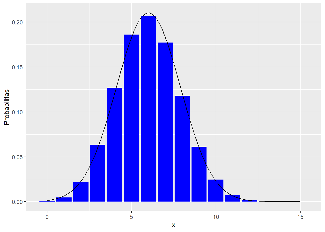 lalu dengan informasi tersebut, kita timpa bar plot binomial dengan plot PDF distribusi normal \(N\left(\mu, \sigma^2\right) = N(6, 3.6)\) sebagai berikut: