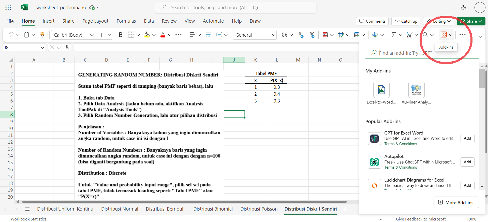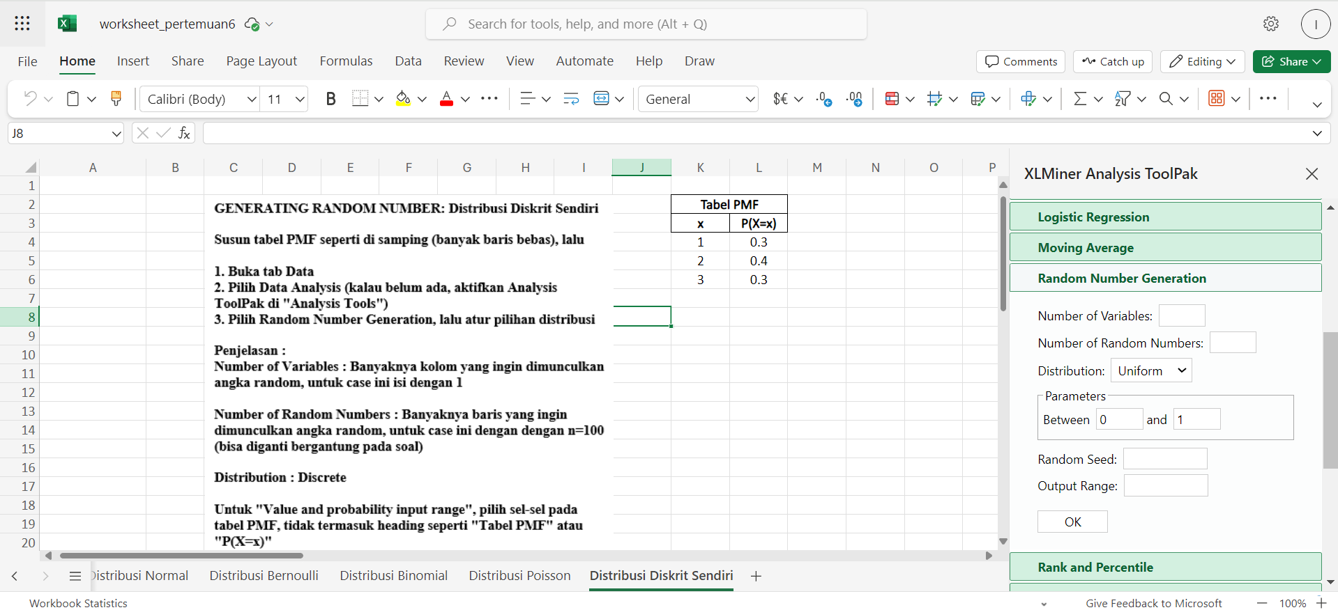 Silakan unduh worksheet berikut untuk bermain di Excel dengan berbagai distribusi, baik diskrit maupun kontinu, yang telah kita bahas, terutama untuk bermain dengan random number generation.