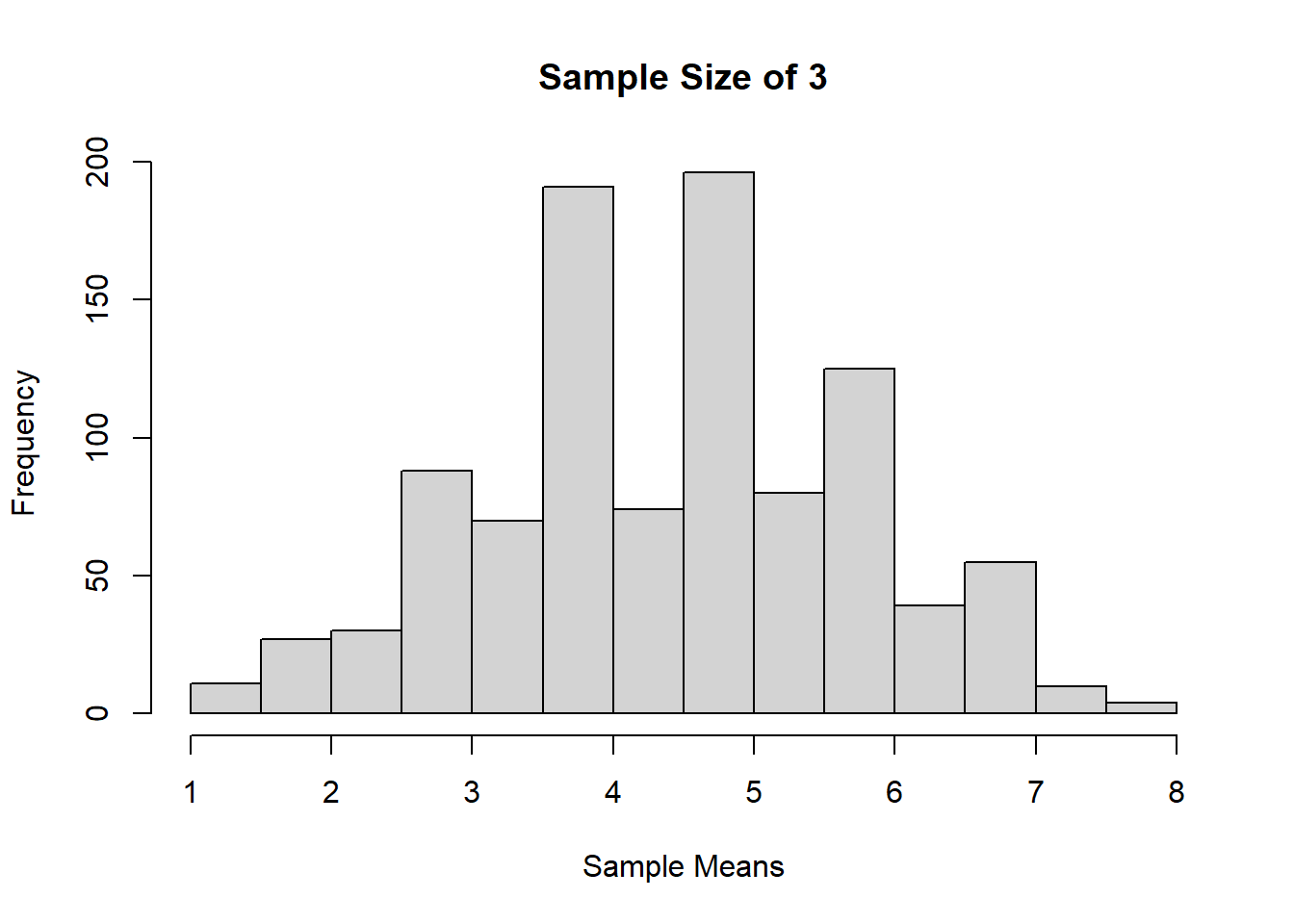 Sekarang, mari kita coba mengambil berbagai ukuran sampel dari populasi tersebut, dengan pengembalian. Secara pemrograman, kita bisa langsung mengambil sampel dari popu1, atau bisa juga mengambil sampel dari distribusi dist1 yang bersesuaian. Pengambilan sampel yang berkali-kali itu bisa dilakukan dengan for loop ataupun dengan fungsi replicate