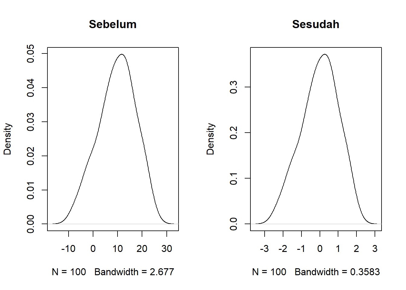 Karena Populasi I dan Populasi II berdistribusi normal, walaupun \(n_1\) dan \(n_2\) berukuran kecil, maka \(\bar{X}_1 - \bar{X}_2\) juga berdistribusi normal.