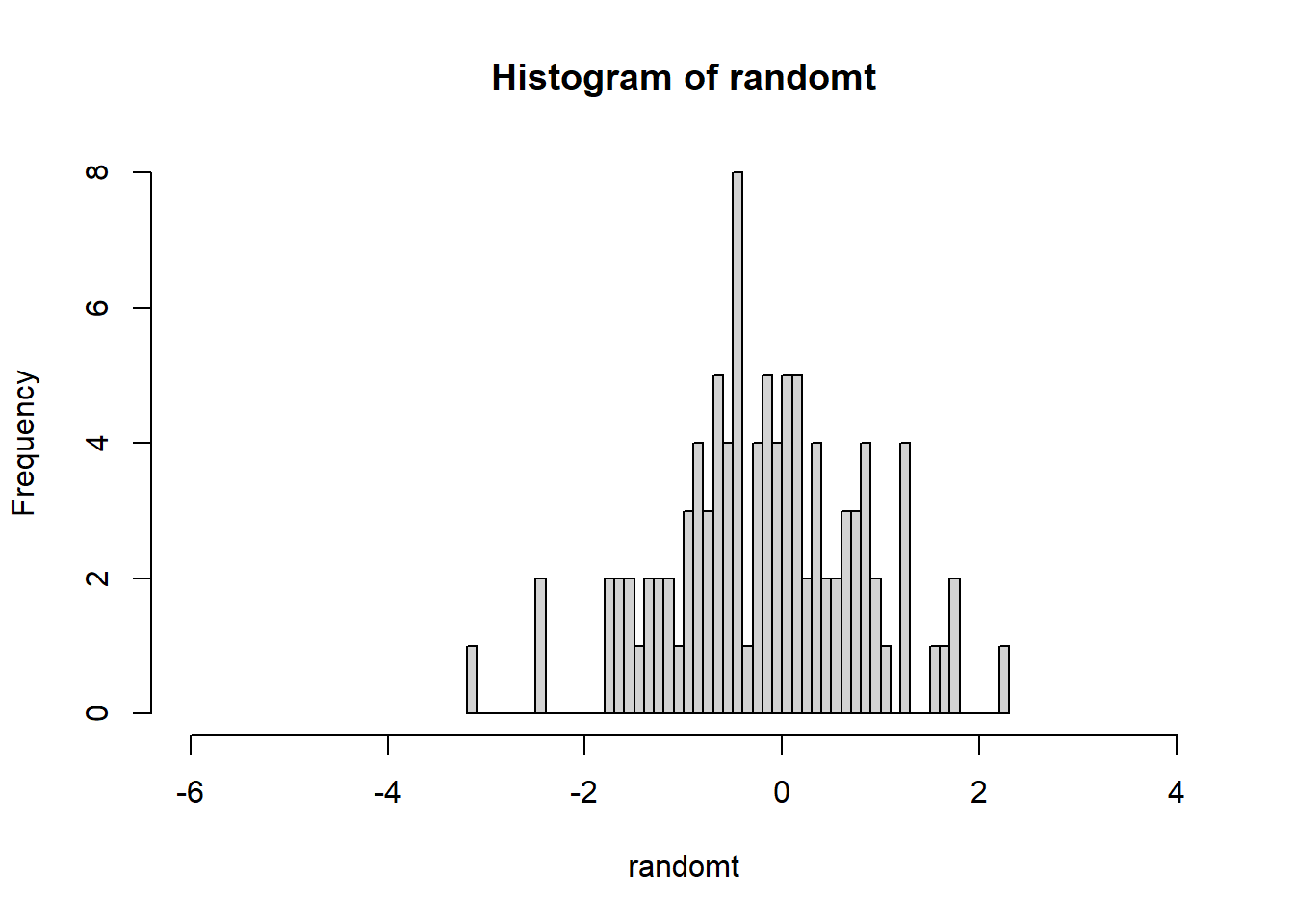 Distribusi-t memiliki satu parameter saja, yaitu degrees of freedom atau derajat bebas, yang dilambangkan df di R.