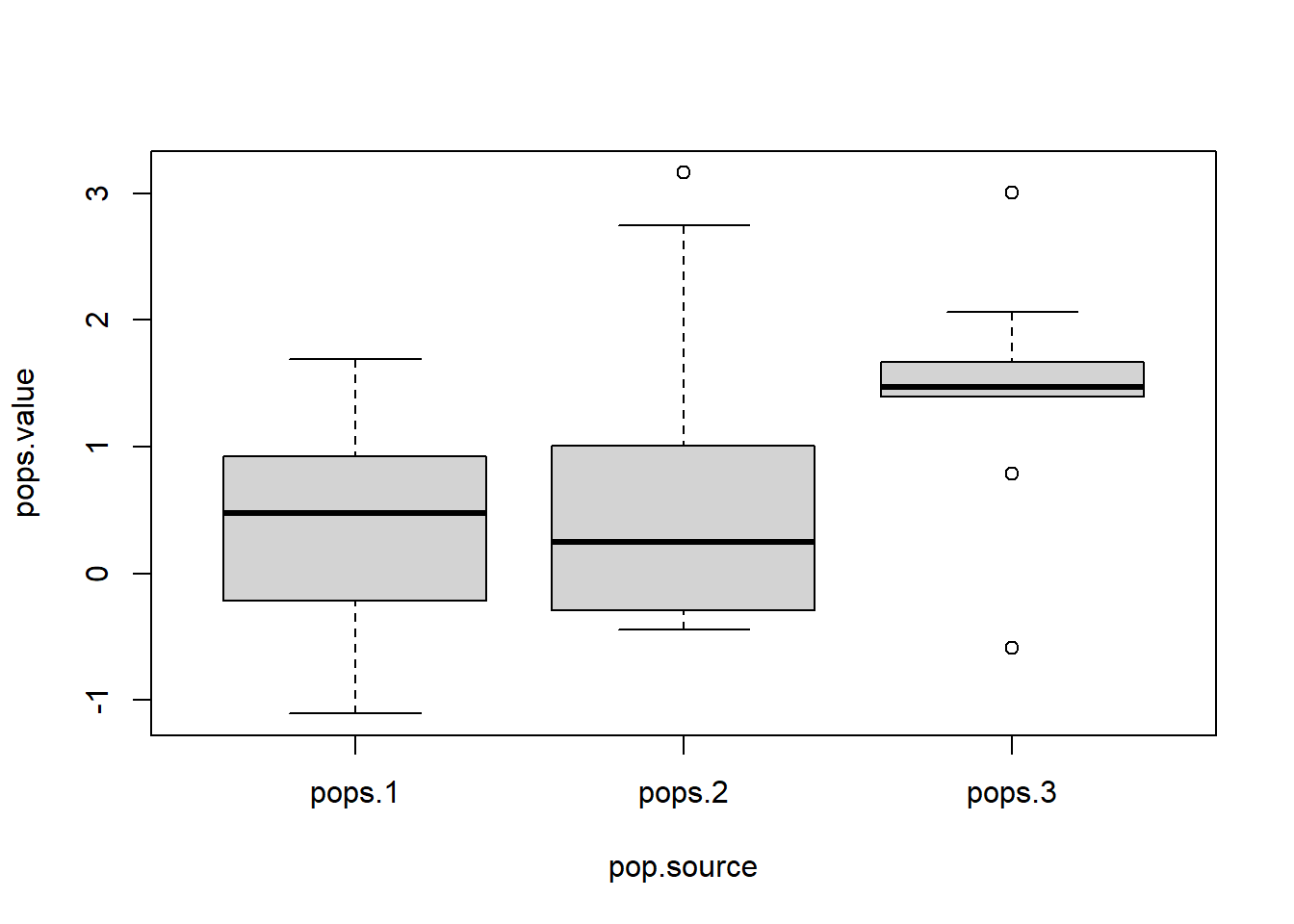 data <- data.frame(pop.source, pops.value)Kita akan melakukan uji ANOVA satu arah dengan fungsi yang sama seperti sebelumnya.