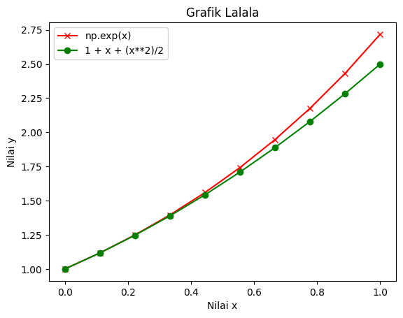 Ada beberapa syntax tambahan pada kode di atas, yaitu : - plt.xlabel(‘Nilai x’) membuat label ‘Nilai x’ pada sumbu x. - plt.ylabel(‘Nilai y’) membuat label ‘Nilai y’ pada sumbu y. - plt.legend([fungsi1,fungsi2]) membuat legenda/keterangan mengenai plot. Argumennya berupa list. - plt.title(‘Grafik Lalala’) untuk membuat judul.