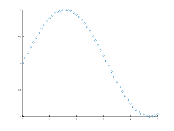 Perhatikan bahwa kita memasukkan array x ke dalam fungsi \(f(x) = x^3\). Untuk contoh yang tadi, fungsi \(\sin(x)\), ketika kita memasukkan array x, Octave paham bahwa tiap nilai pada array perlu diterapkan fungsi \(\sin\).