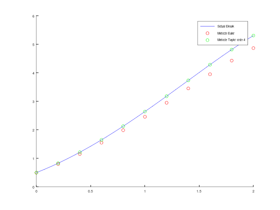 legend("Solusi Eksak", "Metode Euler", "Metode Taylor orde 4");ans =