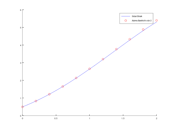 legend("Solusi Eksak", "Adams-Bashforth orde 2")Tabel aproksimasi w, solusi eksak y, dan error: