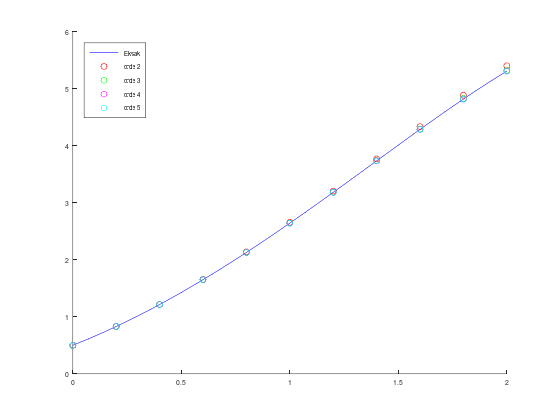 legend("Eksak", "orde 2", "orde 3", "orde 4", "orde 5")