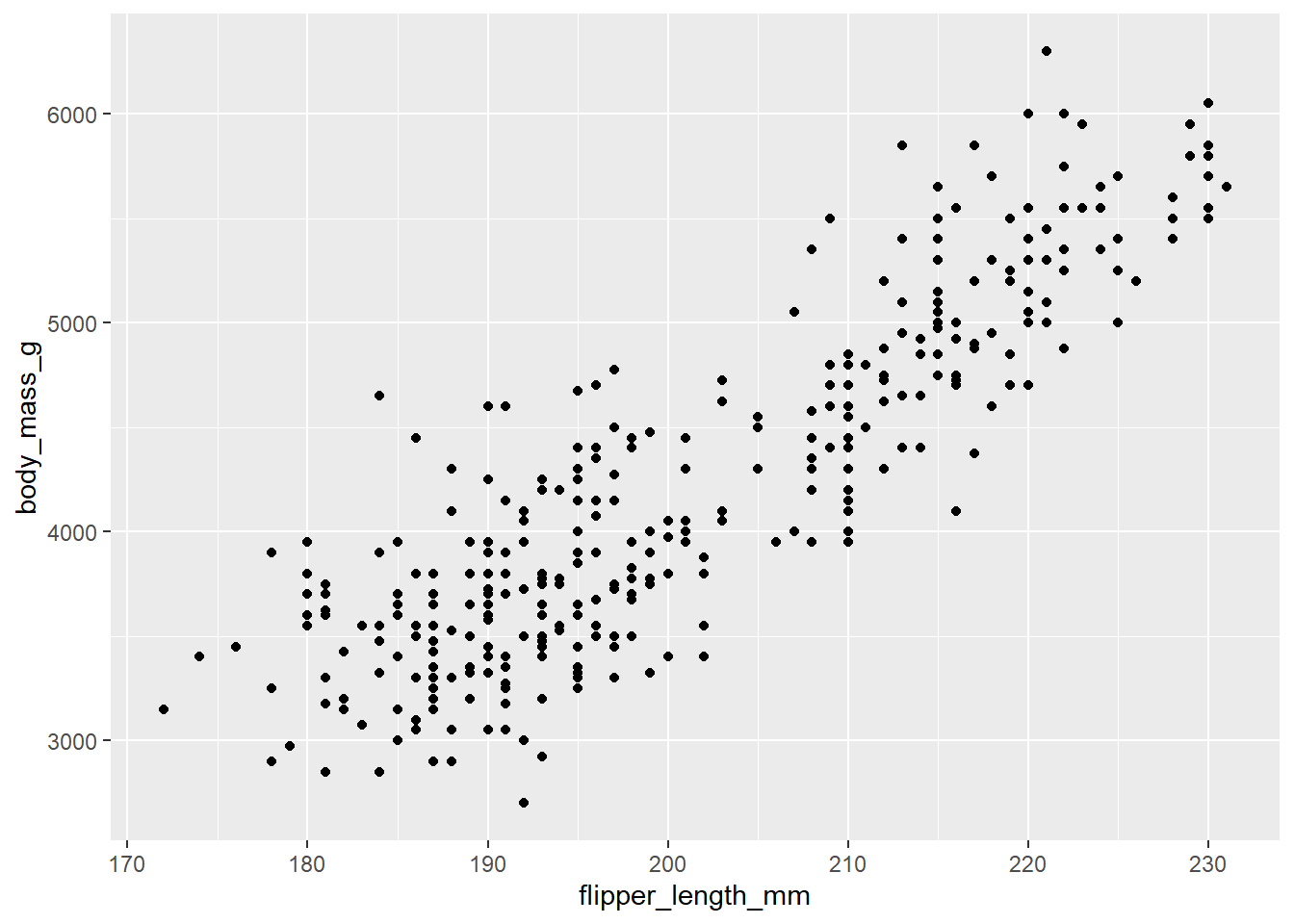 ggplot(penguins, aes(x = flipper_length_mm, y = body_mass_g)) +geom_point()