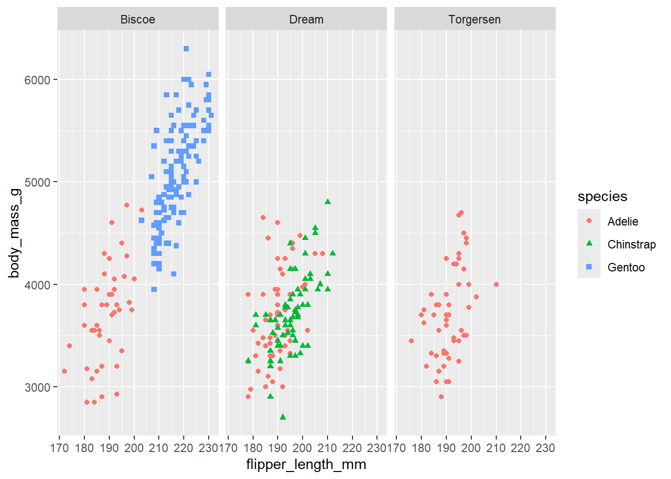Kita dapat menggabungkan lebih banyak variabel ke dalam plot dengan memetakannya ke estetika tambahan. Misalnya, dalam scatterplot berikut, warna titik mewakili spesies dan bentuk titik mewakili pulau.