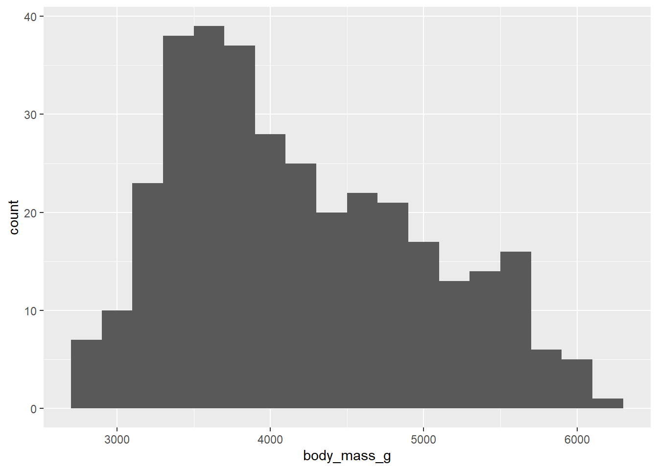 Plot kedua, plot frekuensi relatif yang dibuat dengan menetapkan position = “fill” dalam geom, lebih berguna untuk membandingkan distribusi spesies antar pulau karena tidak dipengaruhi oleh jumlah penguin yang tidak sama di seluruh pulau. Dengan menggunakan plot ini kita dapat melihat bahwa penguin Gentoo semuanya hidup di pulau Biscoe dan membentuk sekitar 75% dari penguin di pulau itu, Chinstrap semuanya hidup di pulau Dream dan membentuk sekitar 50% dari penguin di pulau itu, dan Adelie hidup di ketiga pulau dan membentuk semua penguin di Torgersen.