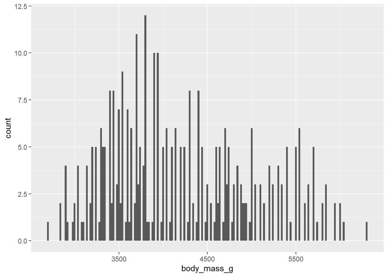 Anda dapat mengatur lebar interval dalam histogram dengan argumen binwidth, yang diukur dalam satuan variabel x. Anda harus selalu menjelajahi berbagai binwidth saat bekerja dengan histogram, karena binwidth yang berbeda dapat mengungkap pola yang berbeda. Dalam plot di bawah ini, binwidth 20 terlalu sempit, menghasilkan terlalu banyak batang, sehingga menyulitkan untuk menentukan bentuk distribusi. Demikian pula, binwidth 2.000 terlalu besar, mengakibatkan semua data dikelompokkan hanya ke dalam tiga batang, dan juga menyulitkan untuk menentukan bentuk distribusi. binwidth 200 memberikan keseimbangan yang masuk akal.