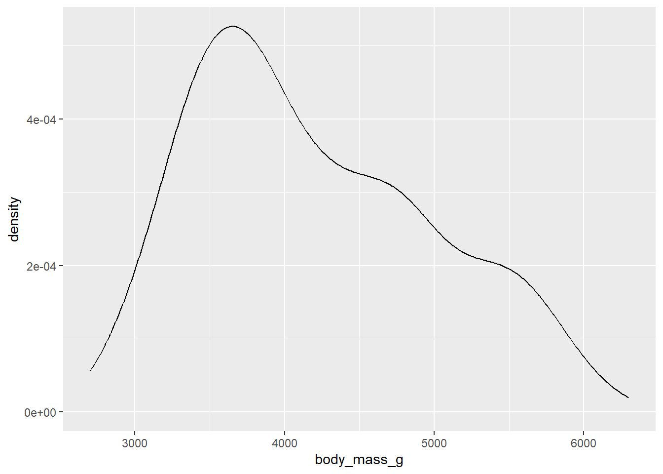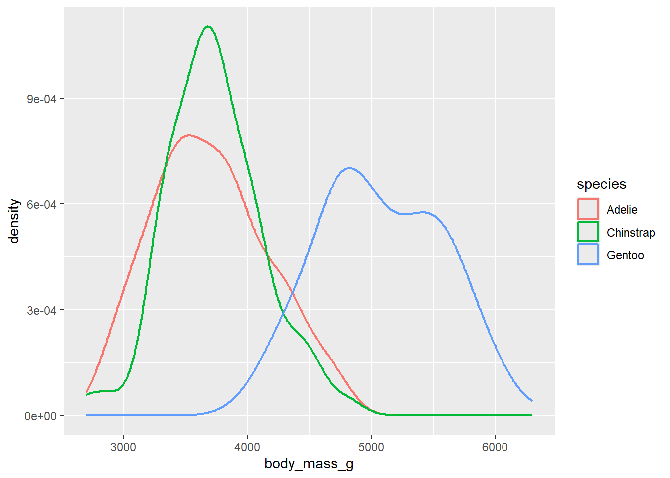 ggplot(penguins, aes(x = body_mass_g, color = species)) +geom_density(linewidth =0.75)