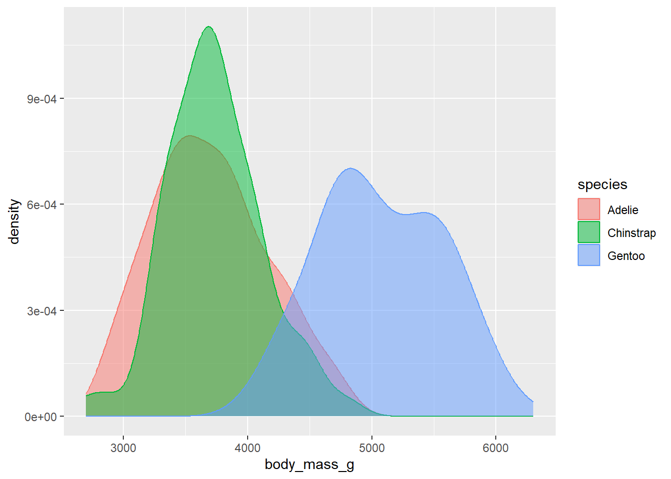 ggplot(penguins, aes(x = body_mass_g, color = species, fill = species)) +geom_density(alpha =0.5)