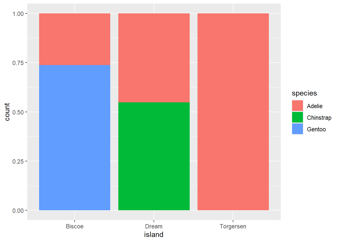 ggplot(penguins, aes(x = island, fill = species)) +geom_bar(position ="fill")