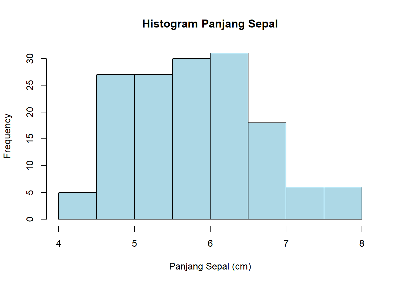 # Histogram untuk melihat distribusi Sepal.Lengthhist(iris$Sepal.Length,main ="Histogram Panjang Sepal",xlab ="Panjang Sepal (cm)",col ="lightblue")