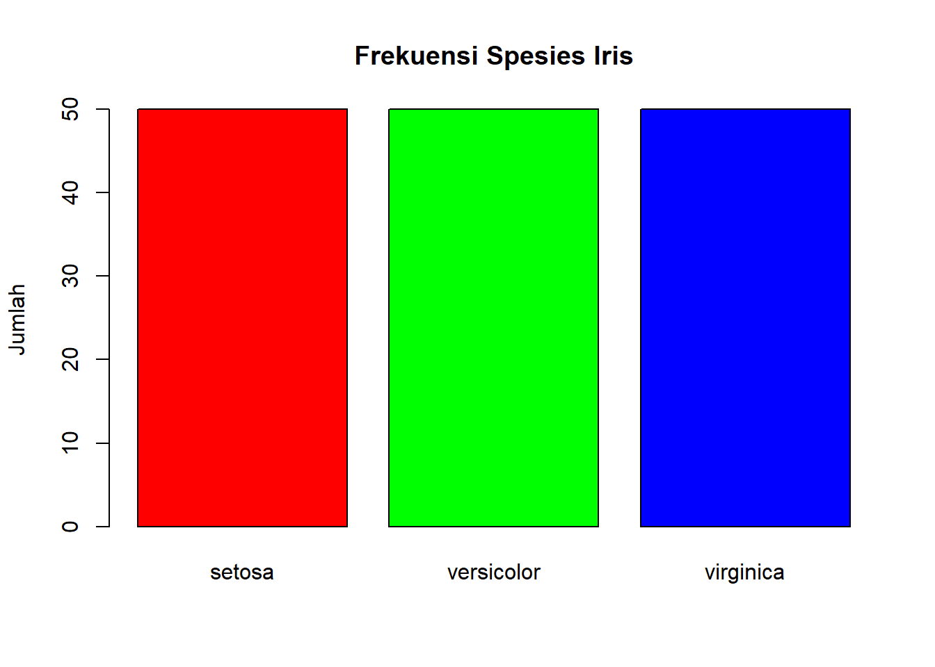 # Bar plot untuk melihat frekuensi tiap spesies# Kita perlu membuat tabel frekuensi dulufreq_spesies <-table(iris$Species)barplot(freq_spesies,main ="Frekuensi Spesies Iris",ylab ="Jumlah",col =c("red", "green", "blue"))