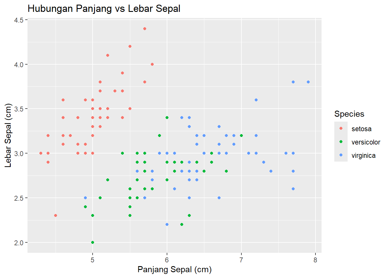 ggplot(data = iris, aes(x = Sepal.Length, y = Sepal.Width)) +geom_point(aes(color = Species)) +labs(title ="Hubungan Panjang vs Lebar Sepal",x ="Panjang Sepal (cm)",y ="Lebar Sepal (cm)")