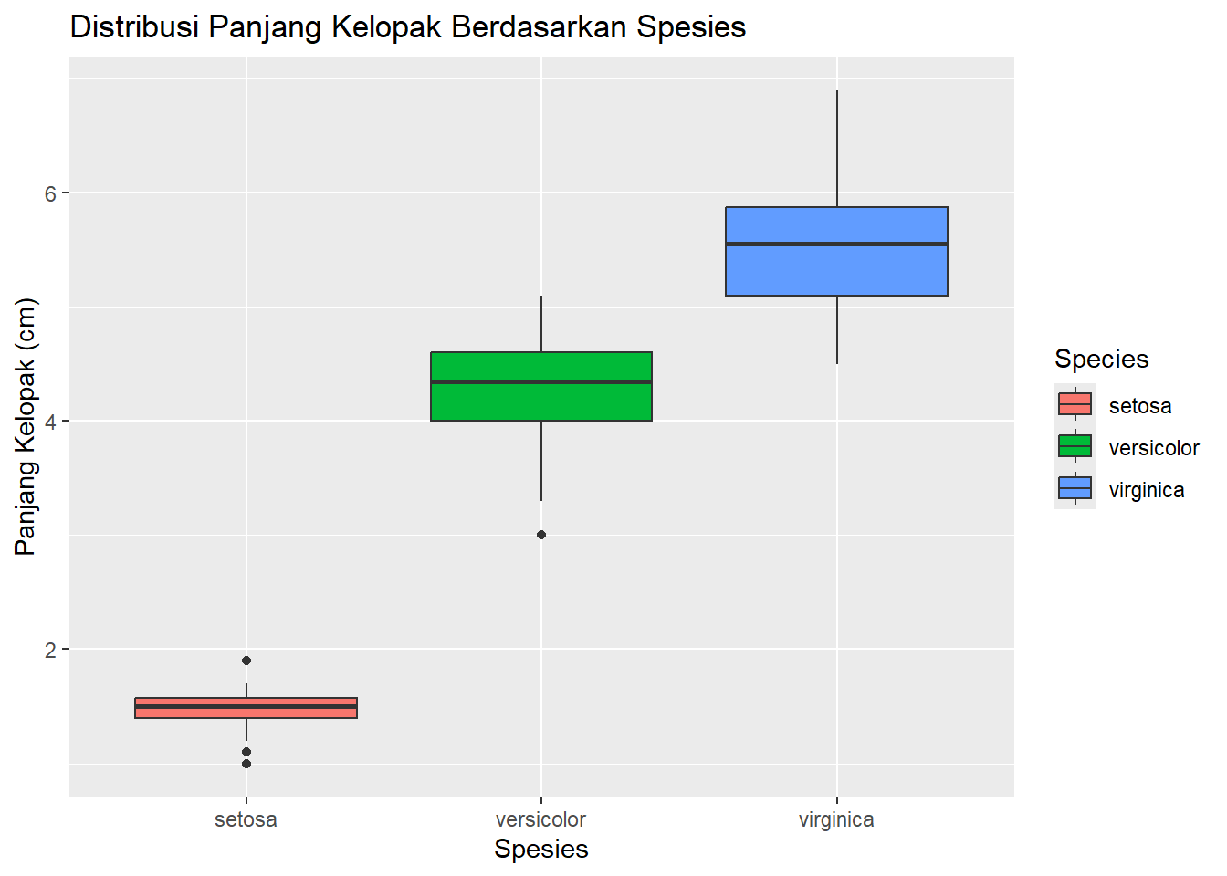 ggplot(data = iris, aes(x = Species, y = Petal.Length)) +geom_boxplot(aes(fill = Species)) +labs(title ="Distribusi Panjang Kelopak Berdasarkan Spesies",x ="Spesies",y ="Panjang Kelopak (cm)")
