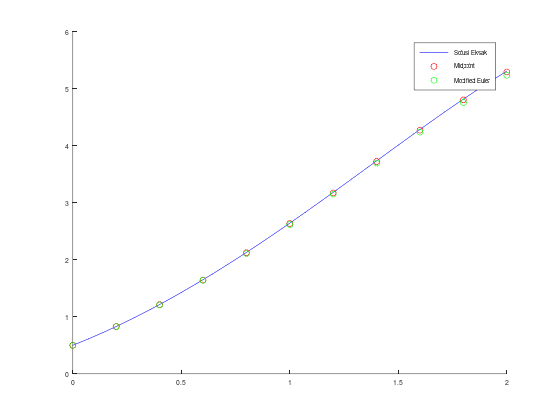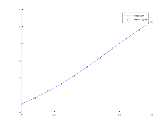legend('Fungsi eksak', 'Midpoint', 'Modified Euler', 'Heun', 'Runge-Kutta orde 4');