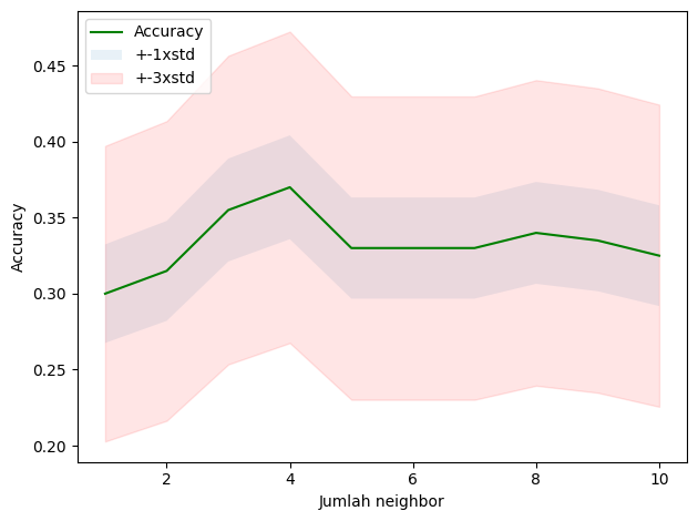 print("akurasi terbaik model adalah", mean_acc.max(), "dengan jumlah k=", mean_acc.argmax()+1)akurasi terbaik model adalah 0.37 dengan jumlah k= 4