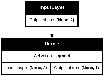 ┏━━━━━━━━━━━━━━━━━━━━━━━━━━━━━━━━━┳━━━━━━━━━━━━━━━━━━━━━━━━┳━━━━━━━━━━━━━━━┓ ┃ Layer (type) ┃ Output Shape ┃ Param # ┃ ┡━━━━━━━━━━━━━━━━━━━━━━━━━━━━━━━━━╇━━━━━━━━━━━━━━━━━━━━━━━━╇━━━━━━━━━━━━━━━┩ │ input_layer_2 (InputLayer) │ (None, 2) │ 0 │ ├─────────────────────────────────┼────────────────────────┼───────────────┤ │ dense_2 (Dense) │ (None, 1) │ 3 │ └─────────────────────────────────┴────────────────────────┴───────────────┘