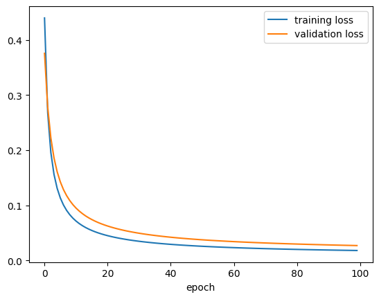 )history2 = model2.fit(inputs_arr, targets_arr, epochs=100, validation_split=0.2)Epoch 1/100 50/50 ━━━━━━━━━━━━━━━━━━━━ 1s 8ms/step - binary_accuracy: 0.9943 - loss: 0.5099 - val_binary_accuracy: 0.9875 - val_loss: 0.3759 Epoch 2/100 50/50 ━━━━━━━━━━━━━━━━━━━━ 0s 4ms/step - binary_accuracy: 0.9917 - loss: 0.2930 - val_binary_accuracy: 0.9875 - val_loss: 0.2786 Epoch 3/100 50/50 ━━━━━━━━━━━━━━━━━━━━ 0s 4ms/step - binary_accuracy: 0.9947 - loss: 0.2099 - val_binary_accuracy: 0.9875 - val_loss: 0.2223 Epoch 4/100 50/50 ━━━━━━━━━━━━━━━━━━━━ 0s 3ms/step - binary_accuracy: 0.9982 - loss: 0.1617 - val_binary_accuracy: 0.9900 - val_loss: 0.1860 Epoch 5/100 50/50 ━━━━━━━━━━━━━━━━━━━━ 0s 4ms/step - binary_accuracy: 0.9967 - loss: 0.1317 - val_binary_accuracy: 0.9900 - val_loss: 0.1609 Epoch 6/100 50/50 ━━━━━━━━━━━━━━━━━━━━ 0s 3ms/step - binary_accuracy: 0.9944 - loss: 0.1183 - val_binary_accuracy: 0.9900 - val_loss: 0.1426 Epoch 7/100 50/50 ━━━━━━━━━━━━━━━━━━━━ 0s 3ms/step - binary_accuracy: 0.9965 - loss: 0.1053 - val_binary_accuracy: 0.9900 - val_loss: 0.1285 Epoch 8/100 50/50 ━━━━━━━━━━━━━━━━━━━━ 0s 3ms/step - binary_accuracy: 0.9977 - loss: 0.0971 - val_binary_accuracy: 0.9900 - val_loss: 0.1175 Epoch 9/100 50/50 ━━━━━━━━━━━━━━━━━━━━ 0s 3ms/step - binary_accuracy: 0.9958 - loss: 0.0851 - val_binary_accuracy: 0.9900 - val_loss: 0.1086 Epoch 10/100 50/50 ━━━━━━━━━━━━━━━━━━━━ 0s 4ms/step - binary_accuracy: 0.9991 - loss: 0.0749 - val_binary_accuracy: 0.9900 - val_loss: 0.1011 Epoch 11/100 50/50 ━━━━━━━━━━━━━━━━━━━━ 0s 3ms/step - binary_accuracy: 0.9992 - loss: 0.0685 - val_binary_accuracy: 0.9900 - val_loss: 0.0948 Epoch 12/100 50/50 ━━━━━━━━━━━━━━━━━━━━ 0s 3ms/step - binary_accuracy: 0.9955 - loss: 0.0684 - val_binary_accuracy: 0.9900 - val_loss: 0.0895 Epoch 13/100 50/50 ━━━━━━━━━━━━━━━━━━━━ 0s 4ms/step - binary_accuracy: 0.9979 - loss: 0.0638 - val_binary_accuracy: 0.9925 - val_loss: 0.0849 Epoch 14/100 50/50 ━━━━━━━━━━━━━━━━━━━━ 0s 3ms/step - binary_accuracy: 0.9977 - loss: 0.0626 - val_binary_accuracy: 0.9925 - val_loss: 0.0808 Epoch 15/100 50/50 ━━━━━━━━━━━━━━━━━━━━ 0s 4ms/step - binary_accuracy: 0.9952 - loss: 0.0611 - val_binary_accuracy: 0.9925 - val_loss: 0.0772 Epoch 16/100 50/50 ━━━━━━━━━━━━━━━━━━━━ 0s 3ms/step - binary_accuracy: 0.9988 - loss: 0.0569 - val_binary_accuracy: 0.9925 - val_loss: 0.0741 Epoch 17/100 50/50 ━━━━━━━━━━━━━━━━━━━━ 0s 4ms/step - binary_accuracy: 0.9963 - loss: 0.0518 - val_binary_accuracy: 0.9925 - val_loss: 0.0712 Epoch 18/100 50/50 ━━━━━━━━━━━━━━━━━━━━ 0s 3ms/step - binary_accuracy: 0.9964 - loss: 0.0522 - val_binary_accuracy: 0.9925 - val_loss: 0.0687 Epoch 19/100 50/50 ━━━━━━━━━━━━━━━━━━━━ 0s 3ms/step - binary_accuracy: 0.9984 - loss: 0.0465 - val_binary_accuracy: 0.9925 - val_loss: 0.0664 Epoch 20/100 50/50 ━━━━━━━━━━━━━━━━━━━━ 0s 3ms/step - binary_accuracy: 0.9984 - loss: 0.0451 - val_binary_accuracy: 0.9925 - val_loss: 0.0643 Epoch 21/100 50/50 ━━━━━━━━━━━━━━━━━━━━ 0s 4ms/step - binary_accuracy: 0.9961 - loss: 0.0475 - val_binary_accuracy: 0.9925 - val_loss: 0.0624 Epoch 22/100 50/50 ━━━━━━━━━━━━━━━━━━━━ 0s 3ms/step - binary_accuracy: 0.9985 - loss: 0.0457 - val_binary_accuracy: 0.9925 - val_loss: 0.0606 Epoch 23/100 50/50 ━━━━━━━━━━━━━━━━━━━━ 0s 3ms/step - binary_accuracy: 0.9982 - loss: 0.0438 - val_binary_accuracy: 0.9925 - val_loss: 0.0589 Epoch 24/100 50/50 ━━━━━━━━━━━━━━━━━━━━ 0s 3ms/step - binary_accuracy: 0.9991 - loss: 0.0393 - val_binary_accuracy: 0.9925 - val_loss: 0.0574 Epoch 25/100 50/50 ━━━━━━━━━━━━━━━━━━━━ 0s 4ms/step - binary_accuracy: 0.9953 - loss: 0.0407 - val_binary_accuracy: 0.9925 - val_loss: 0.0560 Epoch 26/100 50/50 ━━━━━━━━━━━━━━━━━━━━ 0s 3ms/step - binary_accuracy: 0.9974 - loss: 0.0404 - val_binary_accuracy: 0.9925 - val_loss: 0.0547 Epoch 27/100 50/50 ━━━━━━━━━━━━━━━━━━━━ 0s 4ms/step - binary_accuracy: 0.9962 - loss: 0.0427 - val_binary_accuracy: 0.9925 - val_loss: 0.0534 Epoch 28/100 50/50 ━━━━━━━━━━━━━━━━━━━━ 0s 4ms/step - binary_accuracy: 0.9960 - loss: 0.0377 - val_binary_accuracy: 0.9925 - val_loss: 0.0523 Epoch 29/100 50/50 ━━━━━━━━━━━━━━━━━━━━ 0s 5ms/step - binary_accuracy: 0.9986 - loss: 0.0385 - val_binary_accuracy: 0.9925 - val_loss: 0.0512 Epoch 30/100 50/50 ━━━━━━━━━━━━━━━━━━━━ 1s 5ms/step - binary_accuracy: 0.9980 - loss: 0.0353 - val_binary_accuracy: 0.9925 - val_loss: 0.0502 Epoch 31/100 50/50 ━━━━━━━━━━━━━━━━━━━━ 0s 6ms/step - binary_accuracy: 0.9974 - loss: 0.0370 - val_binary_accuracy: 0.9925 - val_loss: 0.0492 Epoch 32/100 50/50 ━━━━━━━━━━━━━━━━━━━━ 0s 7ms/step - binary_accuracy: 0.9992 - loss: 0.0324 - val_binary_accuracy: 0.9925 - val_loss: 0.0483 Epoch 33/100 50/50 ━━━━━━━━━━━━━━━━━━━━ 1s 6ms/step - binary_acc